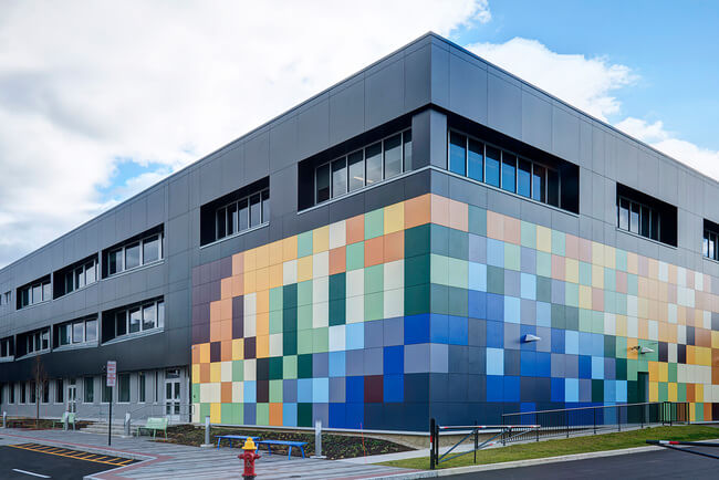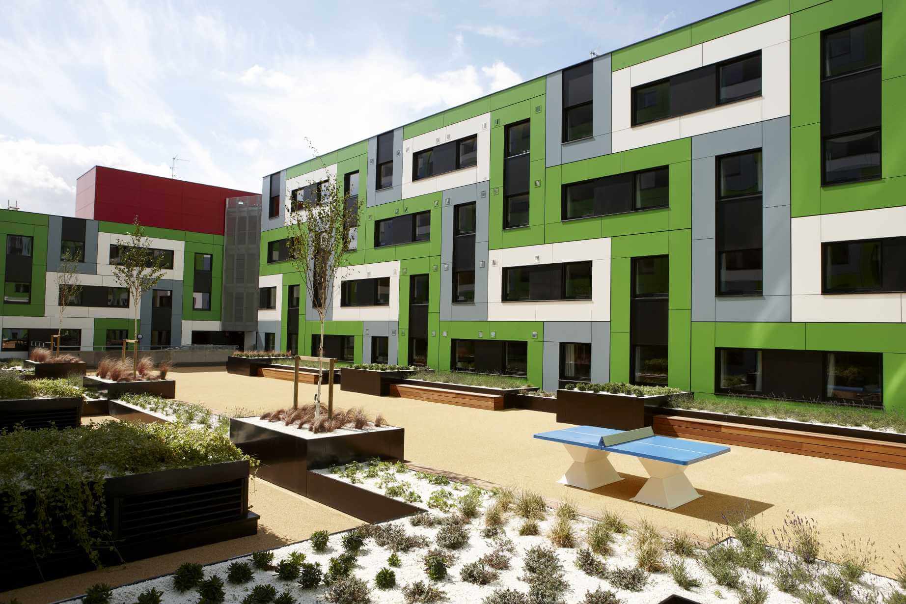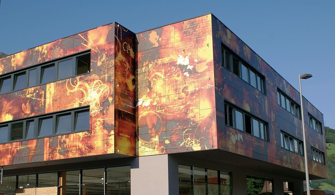 На панелях «Fundermax» никак не отражается даже постоянное сильное воздействие прямых солнечных лучей. Благодаря особой прочности поверхности даже панели наиболее ярких цветов оптимально устойчивы к воздействию солнечного света – это одно из важнейших свойств, обеспечивающих долговечную красоту фасада и защиту от выцветания. Ещё одна особенность панелей «Fundermax» – их устойчивость к краскам граффити, которые могут смываться с панелей даже сильными химическими средствами без малейшего изменения оттенка панелей. Панели предлагаются в широкой гамме цветов (декоров) – от однотонных, имитации дерева или индивидуальных декоров до декоров 3D печати.